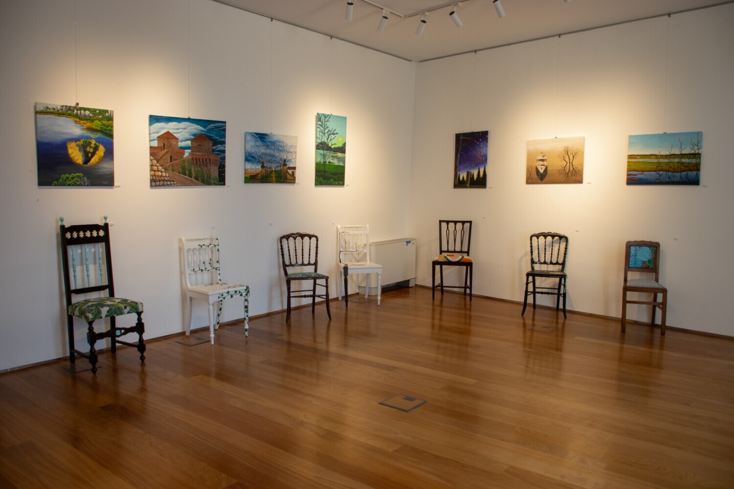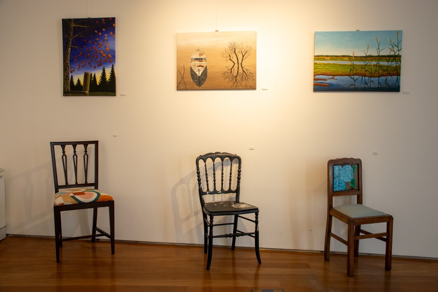 Nesta exposição, Dina Oliveira mostra-nos a sua identidade aliando duas das suas paixões: a pintura acrílica sobre tela, representando elementos da Natureza que compõe as paisagens, e a recuperação de cadeiras em fim de vida, vendo nelas uma autêntica obra de arte e transformando-as visualmente, mantendo a sua função.