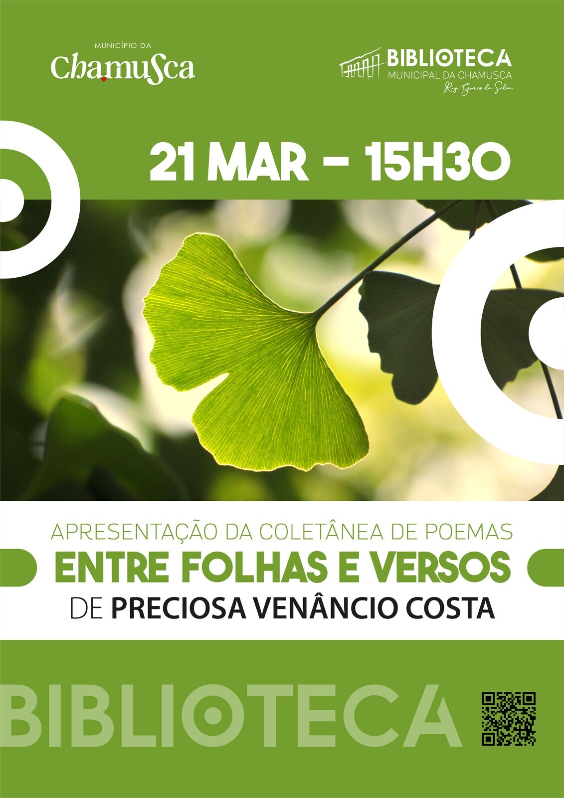 Entre 21 de março e 4 de abril, a Biblioteca Municipal da Chamusca apresenta a exposição Entre Folhas e Olhares, dedicada à árvore Ginkgo Biloba, símbolo de resistência e longevidade. A mostra reúne fotografias desta árvore emblemática, poemas da autoria de Preciosa Venâncio Costa e trabalhos artísticos realizados pelos alunos das AEC (Atividades de Enriquecimento Curricular) e pelos alunos do Clube de Yoga.