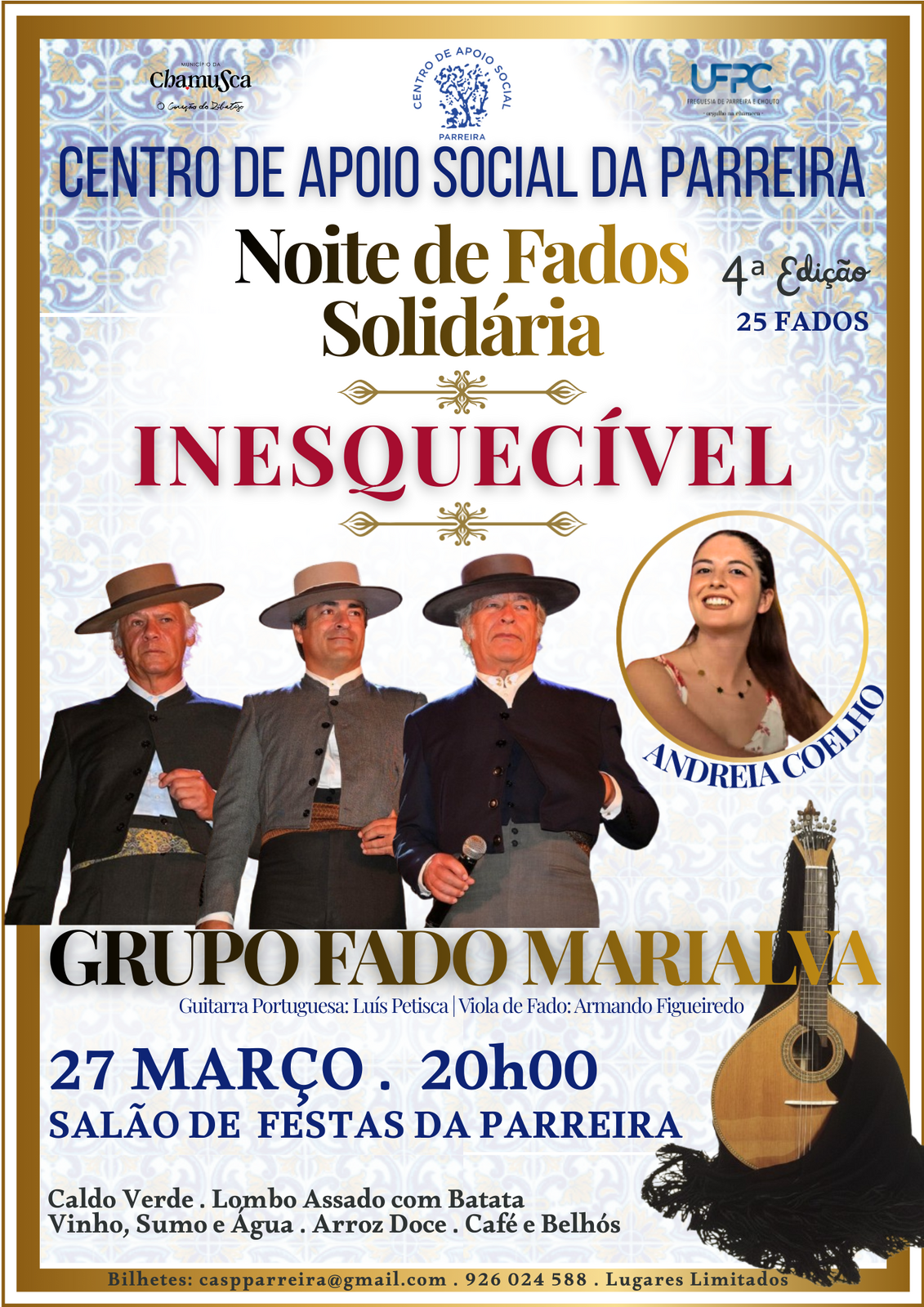 No próximo dia 27 de março o Centro de Apoio Social da Parreira organiza uma Noite de Fados Solidária.