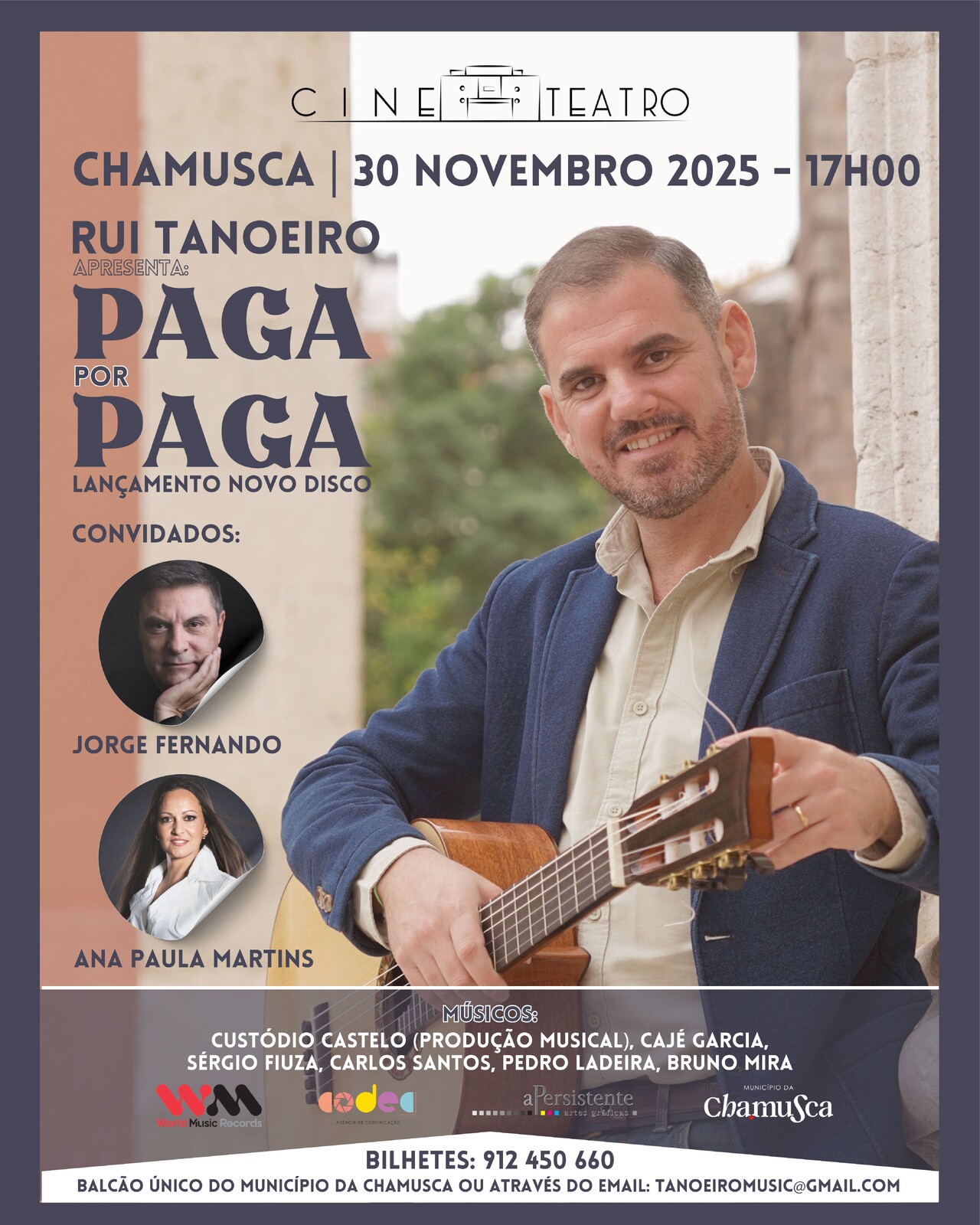 O Cineteatro da Chamusca recebe a apresentação do novo trabalho do fadista chamusquense Rui Tanoeiro. “Paga por Paga” é um espetáculo com direção musical de Custódio Castelo e, no dia 30 de novembro, Rui Tanoeiro conta com os convidados Jorge Fernando e Ana Paula Martins, acompanhados dos músicos Cajé Garcia, Sérgio Fiuza, Pedro Ladeira, Carlos Santos e Bruno Mira, para um final de tarde inesquecível.