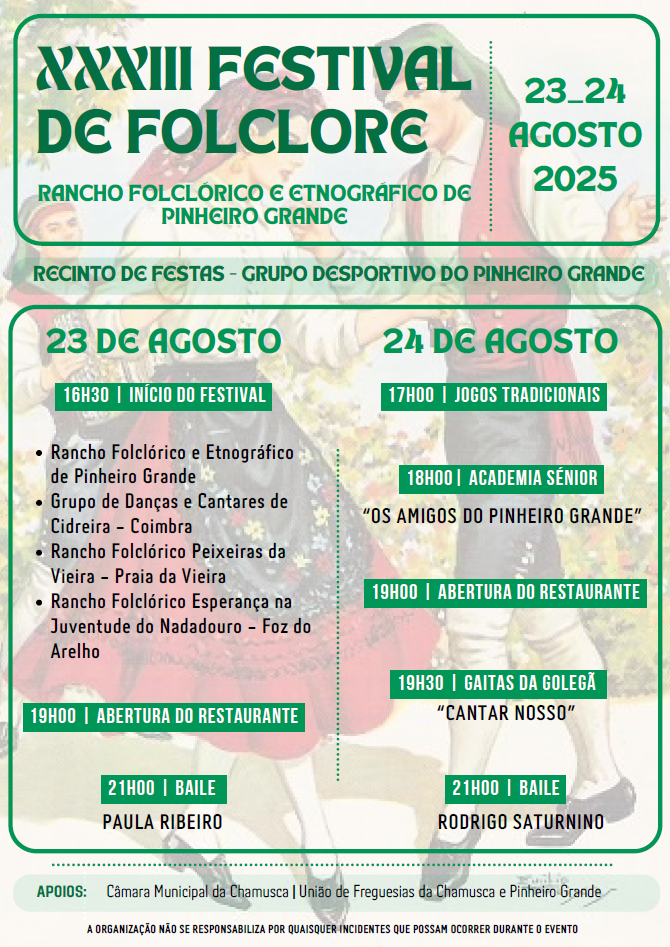 A aldeia do Pinheiro Grande recebe o XXXIII Festival de Folclore, promovido pelo Rancho Folclórico e Etnográfico do Pinheiro Grande.