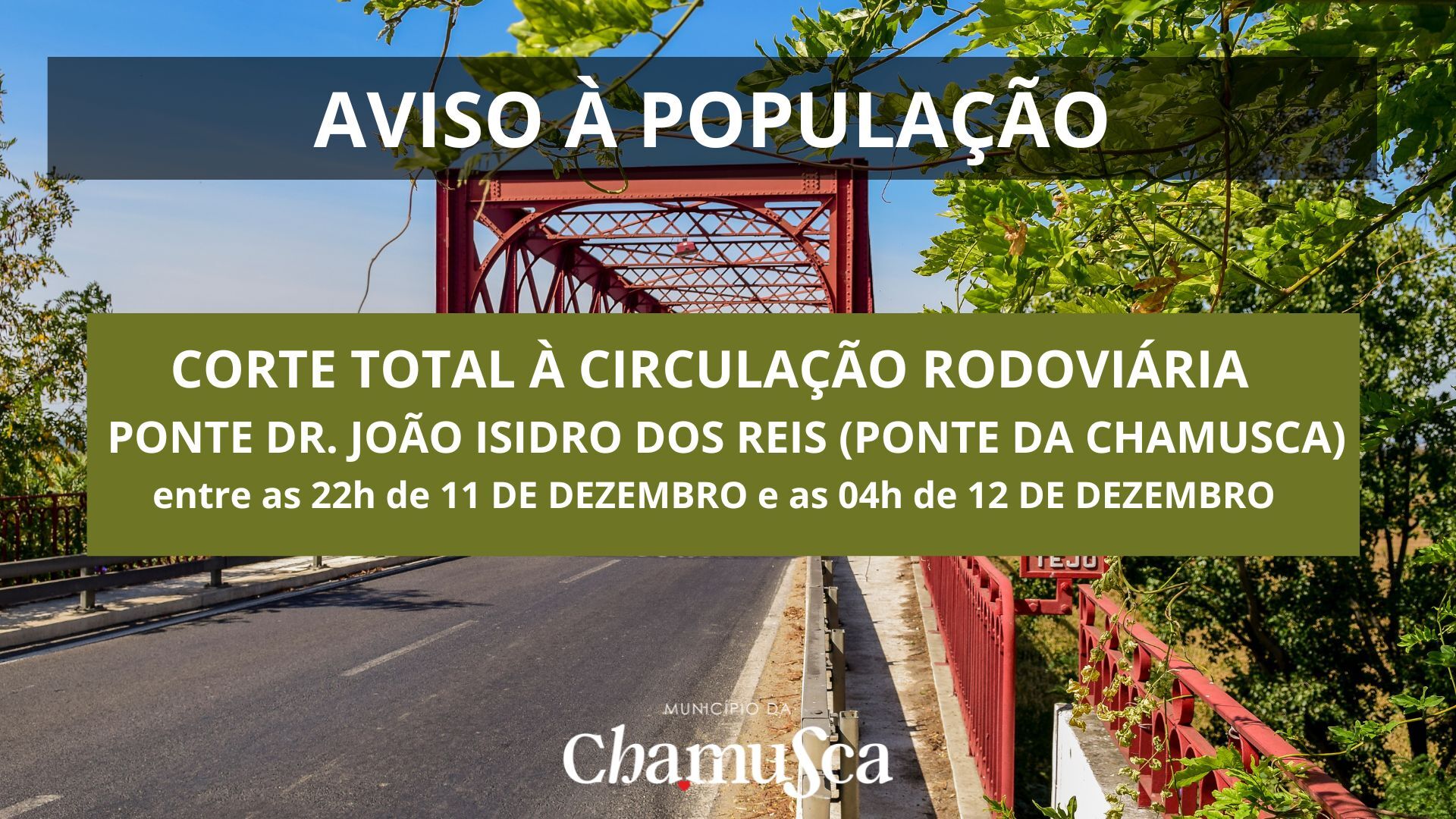 A Infraestruturas de Portugal informa que irá intervir nas infraestruturas de iluminação rodoviária da Ponte Dr. João Joaquim Isidro dos Reis (Ponte da Chamusca), entre o km 47.000 e o km 47.950 da EN243, no concelho da Chamusca, distrito de Santarém.